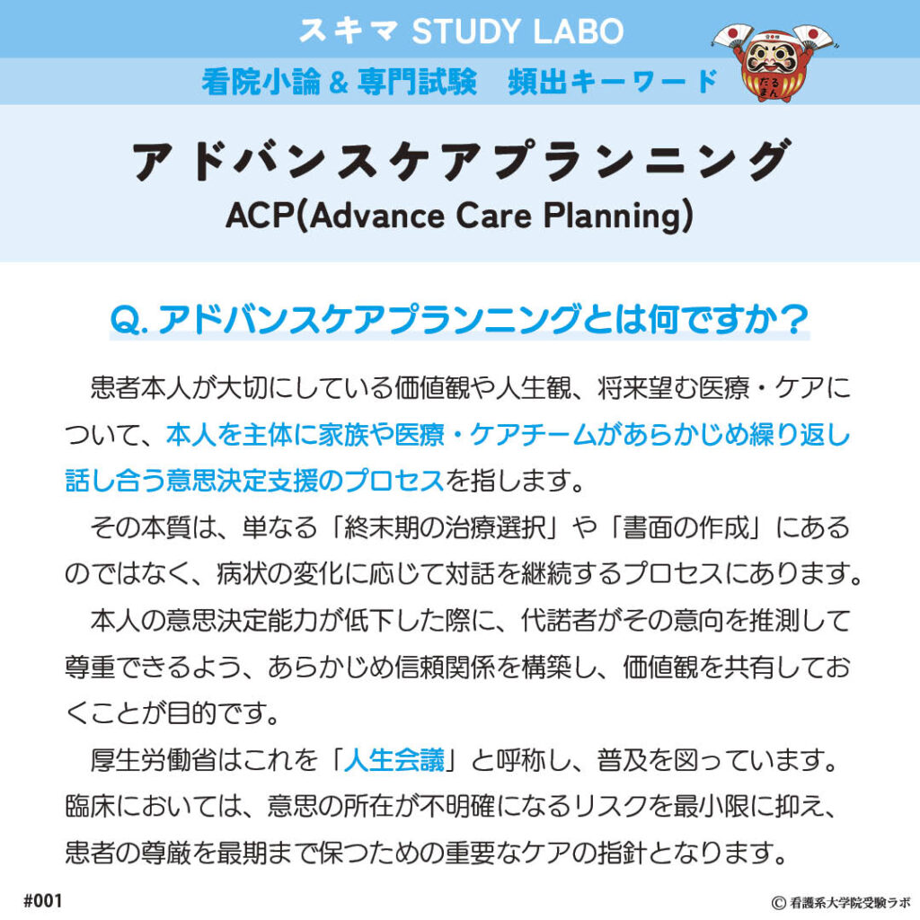 看護系大学院受験の専門・小論対策として頻出のキーワード「アドバンスケアプランニング」について、受験生の立場で調べてみました。