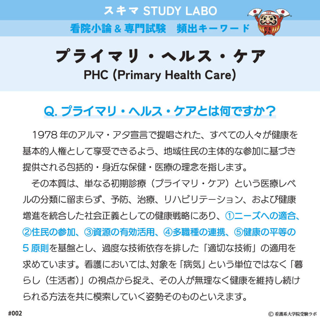 看護学生時代に誰もが一度は耳にした「プライマリ・ヘルス・ケア」ですが、振り返ってみれば、ただ暗記するだけの目先の勉強で、誰かに問われたら説明できるほどの記憶はなく…
